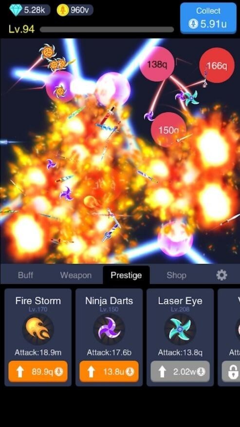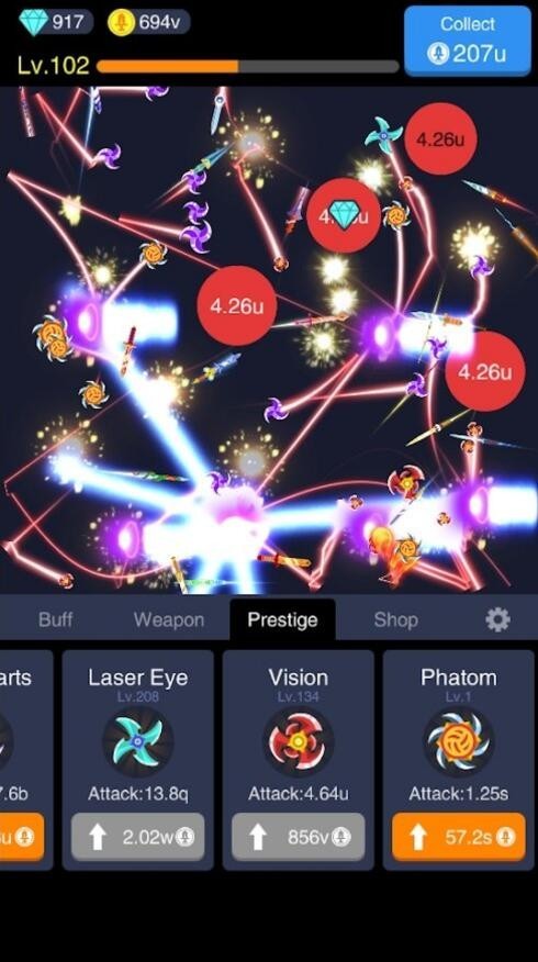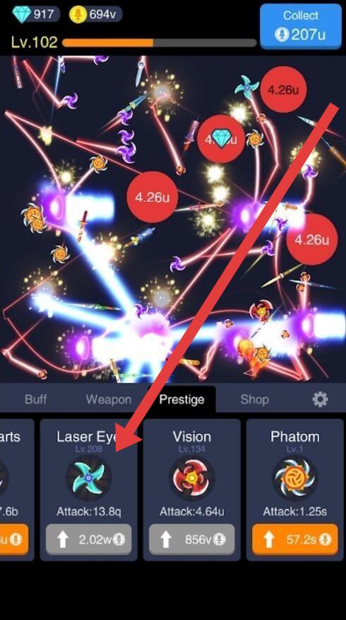 3、等级达到Lv.102后,继续在【Prestige】栏升级技能(如【Laser Eye】),依据攻击数值(13.8q)和资源储备合理操作,提升实力,应对复杂战斗场景。