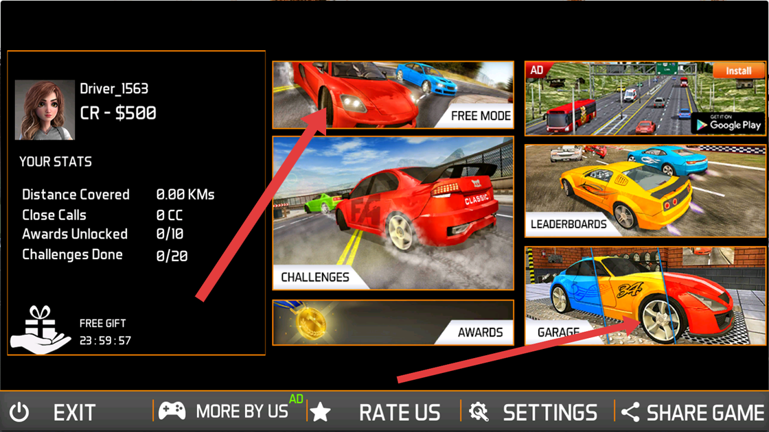 1、进入游戏先点击右下角的GARAGE进入车库购买一辆车。