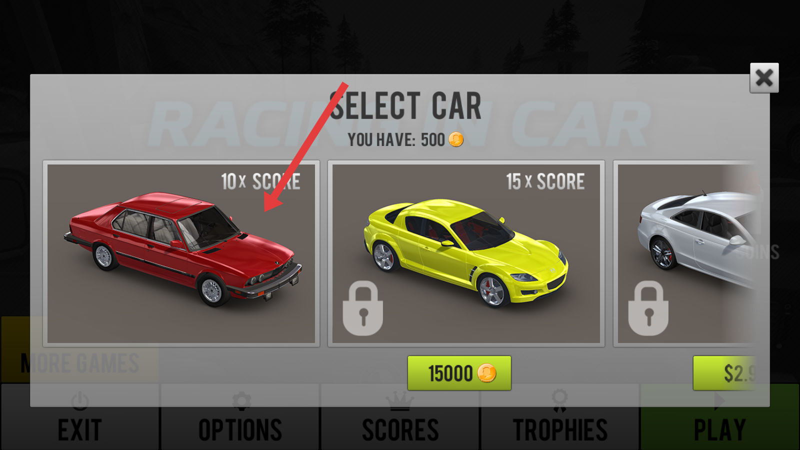 2、选择一辆车辆,后面上锁的车辆都需要金币购买才能解锁。