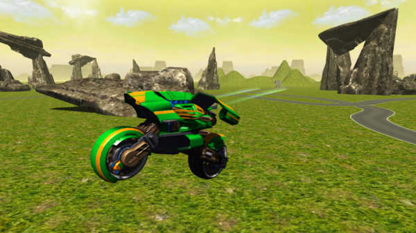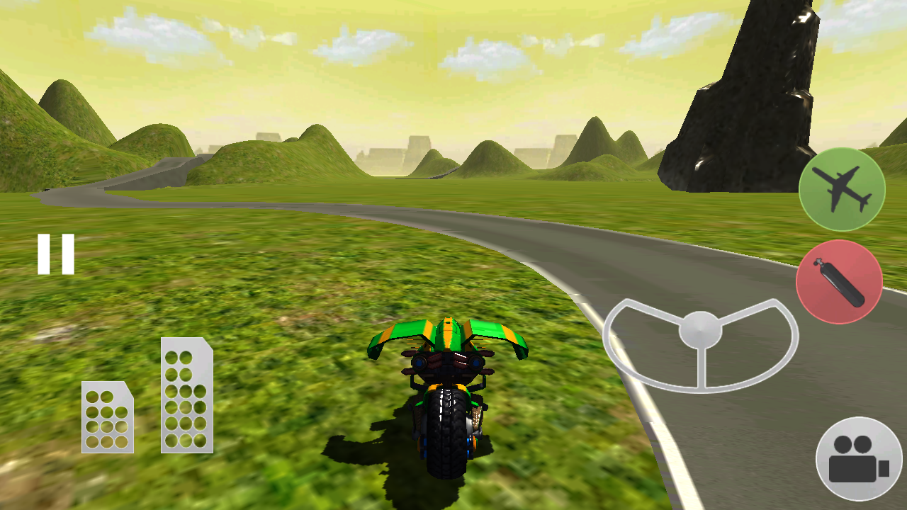 2、驾驶绿色飞行摩托车在道路上行驶,利用左下角的刹车和油门按钮控制车速,通过右下角方向盘控制方向。