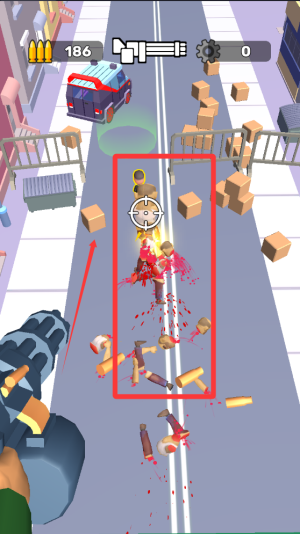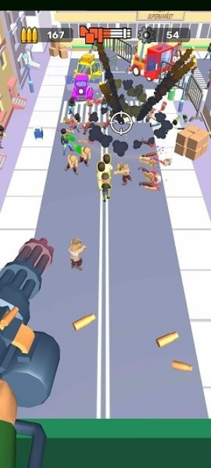 1、核心战斗机制,采用"移动中射击"的基础玩法,玩家需要在保持高速移动的同时,精准消灭追击的僵尸。弹药系统增加了策略维度,需要合理规划换弹时机。
