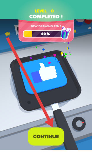 3、成功完成绘制后,出现【LEVEL 0 COMPLETED!】提示,点击【CONTINUE】进入下一关,还可关注奖励进度(如【22%】)。