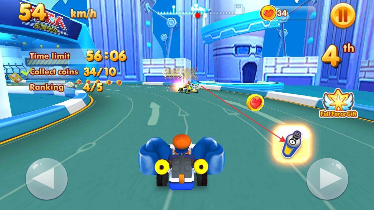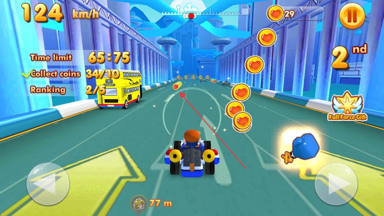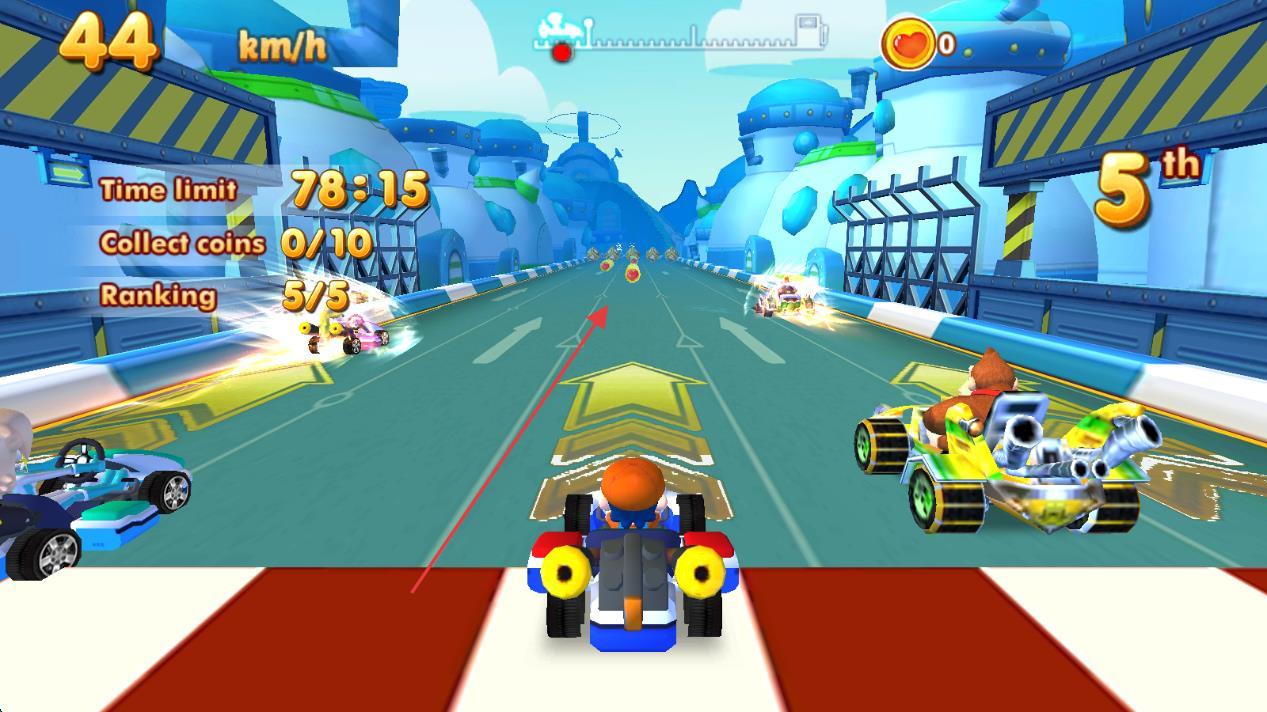 2、比赛中途,灵活躲避赛道陷阱,巧妙使用拾取的道具干扰对手,同时保持最佳行驶路线,不断拉近与领先者的距离。