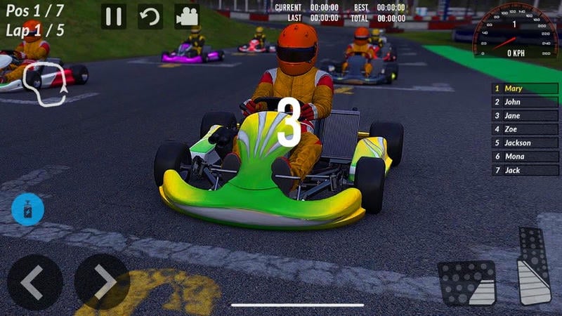1、进入游戏,先从初始赛车与赛道选起,操控卡丁车在起步时把握时机,利用漂移积攒动力,开启这场精彩的竞速之旅。