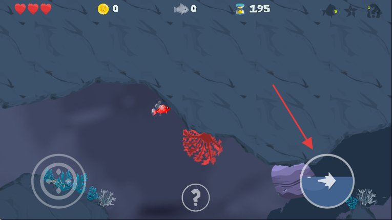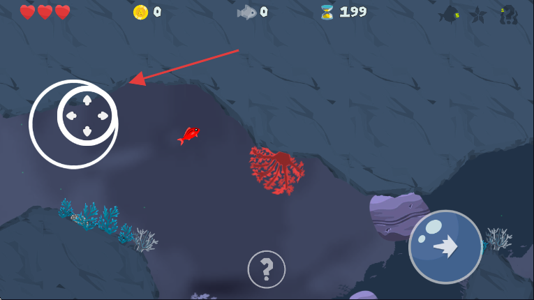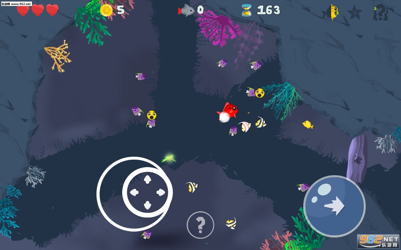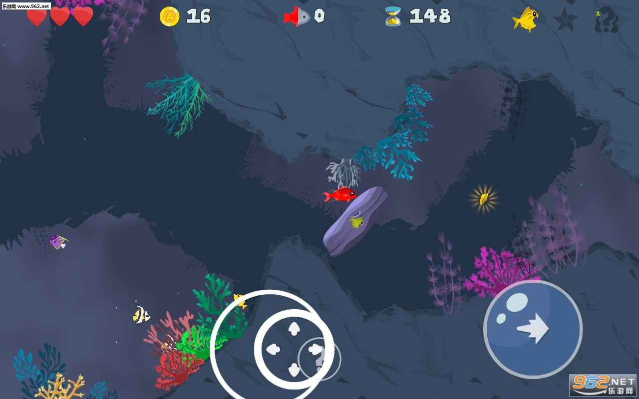 2、通过左边的圆形控制键(方向键)操控角色(如小鱼)移动,躲避障碍或寻找目标。