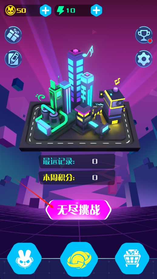 1、在游戏主界面,点击无尽挑战按钮,进入游戏关卡。