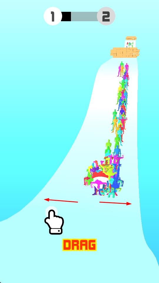1、玩家通过拖动屏幕操控彩色人群在道路上前进,引导人群移动方向。