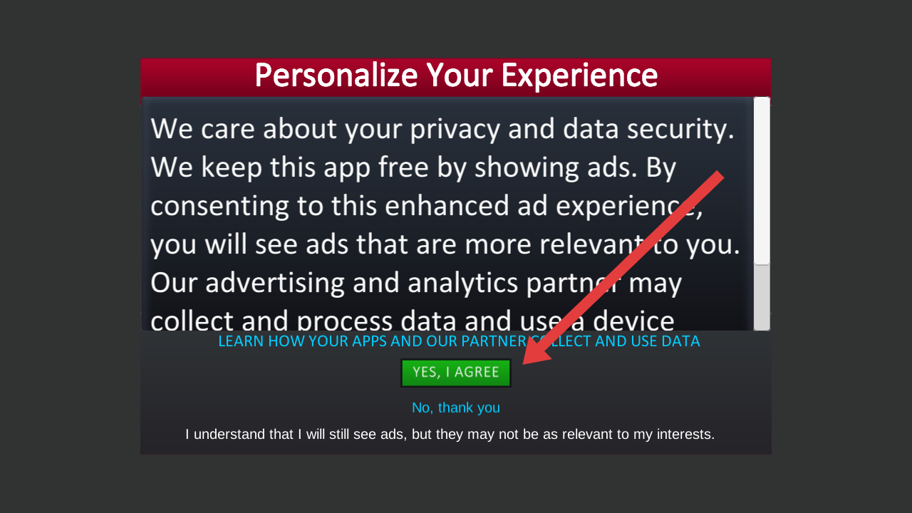 1、进入游戏后出现隐私设置界面,点击【YES,IAGREE】按钮同意广告体验设置,以便获得更相关广告内容。