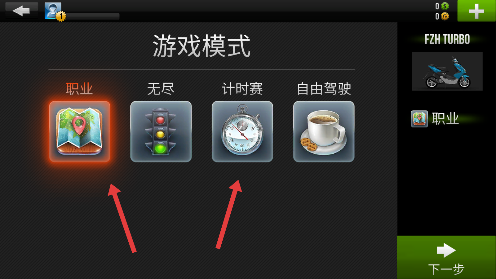 3、选择职业赛和计时赛均获取名次均可以赢取奖金改装爱车。
