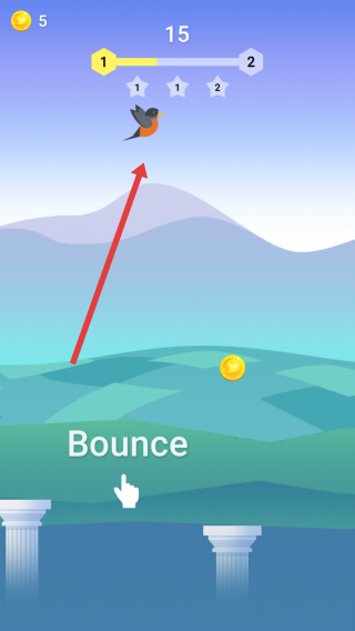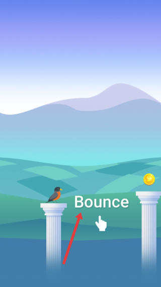 1、在游戏起始界面,看到小鸟站在石柱上,根据“Bounce”提示和手指图标,点击屏幕让小鸟弹起。