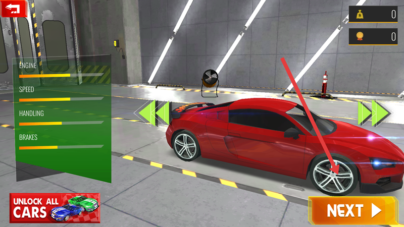 2、再车库中点击左右箭头预览车辆,左边菜单显示车辆属性,然后点击NEXT下一步。