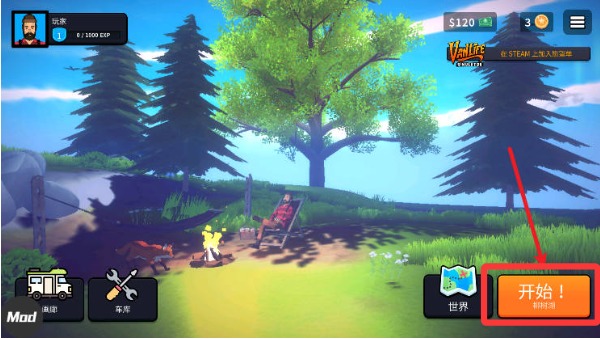 1、进入房车生活模拟器,点击右下角的“开始”按钮,就可以进入游戏了。