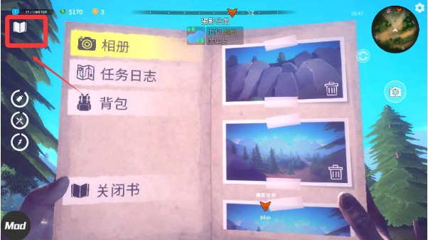 2、旅途中,你需要在各个地点探索,收集物资和金钱,为接下来的旅程做好准备,点击左上角的图书图标,能翻阅拍摄的照片,浏览地图,或整理背包物品。