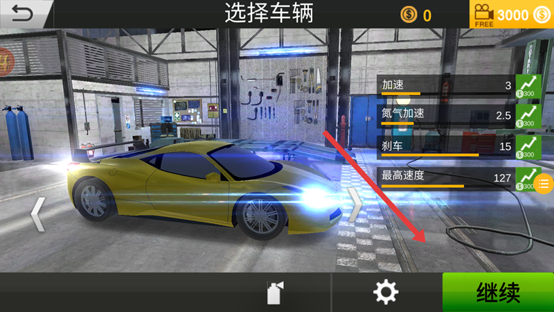 1、打开游戏先进车库选择车辆,点击左右箭头切换,然后点击继续。