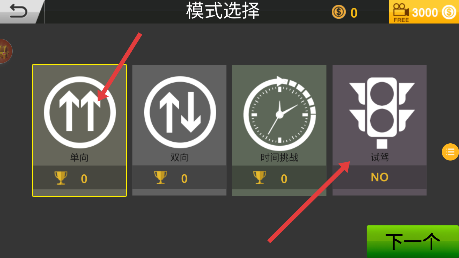 2、选择一个游戏模式,单向车道适合新手,除了试驾都可以赢取奖金。