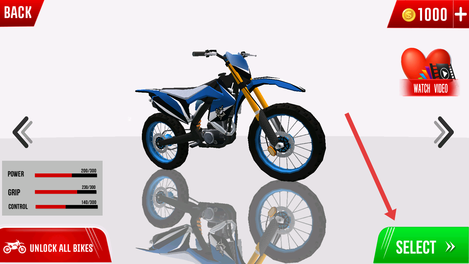 2、解锁车辆需要金币,默认选择新手装备摩托车,点击右下角的SELECT。