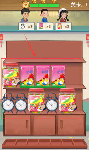 2、三消资源获取,通过经典消除游戏赢得进货资金,不同关卡对应不同商品类型。