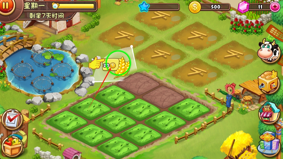 3、选择价值20的农作物,点击对应农田,完成农作物的种植。