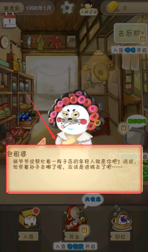 3、根据游戏提示,点击包租婆帮忙看一阵子店铺。
