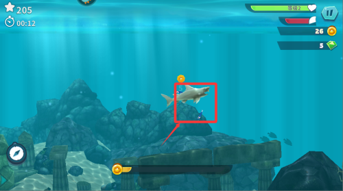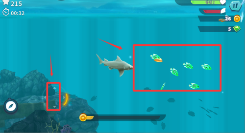 1、游戏开始选择小鲨鱼,先吃小鱼积累经验值。注意避开水母、电鳗等危险生物,它们会让鲨鱼掉血。