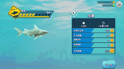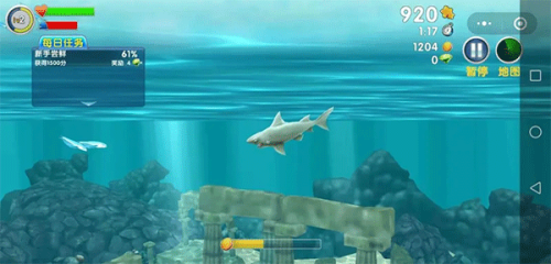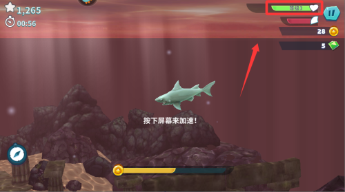 3、注意屏幕左上角的饥饿值,及时进食避免饿死。完成任务可获得金币,用来购买新鲨鱼或升级属性。