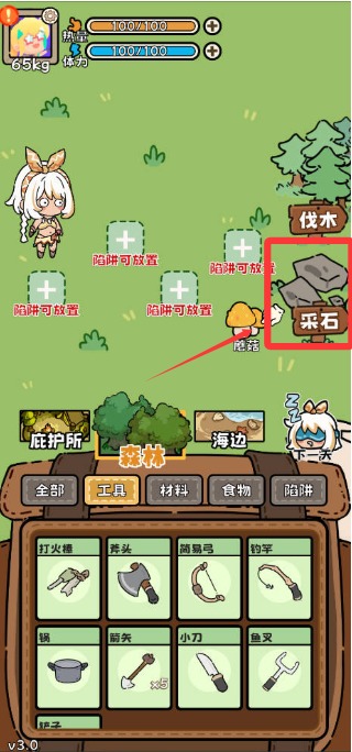 1、开局先挖下石头,用石头绳子做三个陷阱放好。