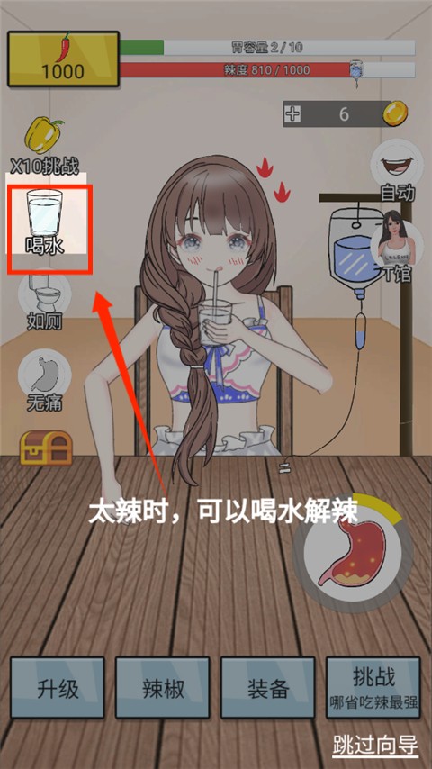 2、当感觉太辣难以忍受时,及时点击喝水按钮,降低辣度,保持角色状态,继续投入到后续的吃辣挑战中。