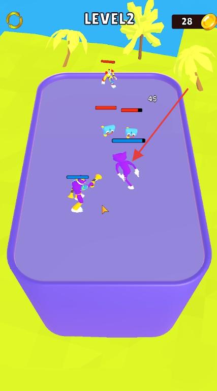 2、在【LEVEL2】界面,关注金币数28,按箭头指向留意紫色角色,在战斗中精准操作应对敌人。
