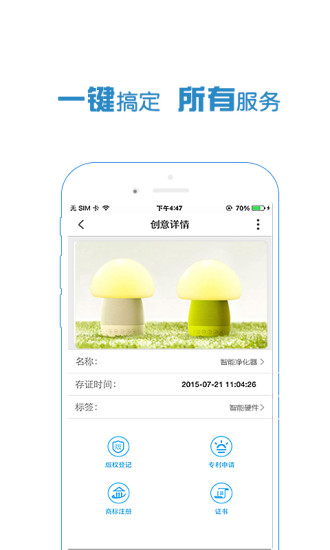 创意宝app安卓版是一款非常具有使用价值的个人知识产权自我保护的手机工具,在生活中你有好的创意、发明等个人知识产权需要进行商标注册、专利申请的时候,通过该软件,为你提供方便快捷的一站式服务,拍照。录像等方式,成本低,效率高,快速保护你的个人知识产权!有需要的朋友快来下载吧!