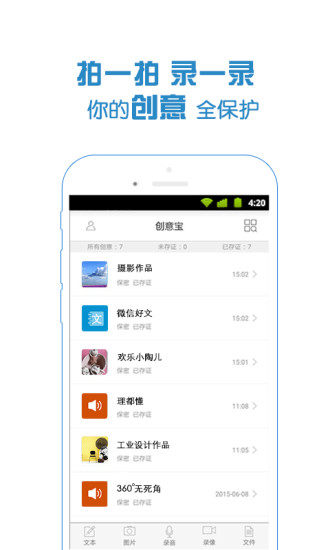创意宝是源创云旗下的重拳产品,该产品是国内首创为用户提供从创新创意诞生之日起即毫无门槛地实现一站式知识产权自我合法保护的产品。 “创意宝”提供创新创意实时电子存证保护、商标注册及外观设计专利申请等知识产权一站式服务,以“你的创意,我证明!”为使命,通过“拍一拍,录一录,你的创意全保护”的便捷方式,低廉的成本,轻松帮用户完成所有保护。