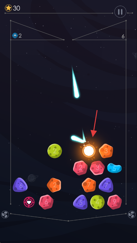 2、多样关卡策略挑战:设计海量关卡与特色场景(如陨石带、黑洞区),每个关卡包含独特行星排列与障碍物,需灵活调整射击角度,利用「弹射摧毁多个目标」。