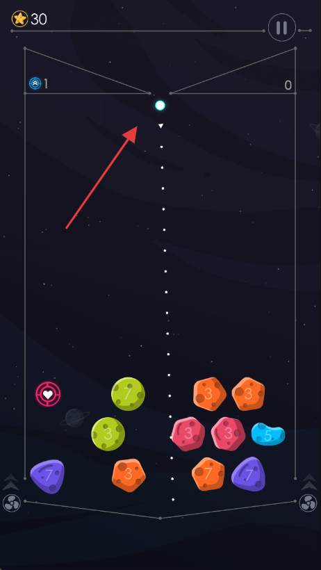 1、滑动射击精准摧毁:手指滑动屏幕瞄准行星,松开即可射出球体,利用行星间的缝隙与反弹轨迹,一次性撞击多个目标,注意观察行星大小标识。