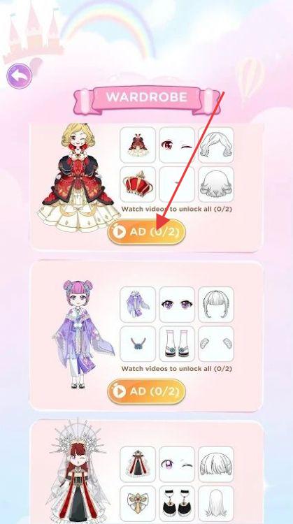 3、衣柜界面展示了不同风格的套装,点击按钮观看视频,就能解锁更多服饰部件,从而丰富装扮选择,打造更为精美的造型。