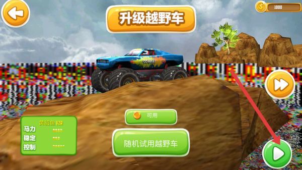 1、进入游戏界面,点击右下角【绿色播放按钮】,选择或试用越野车,开启越野挑战。