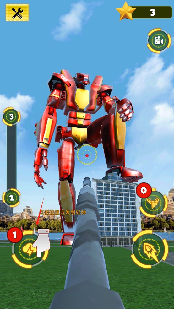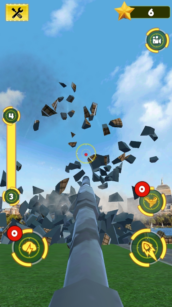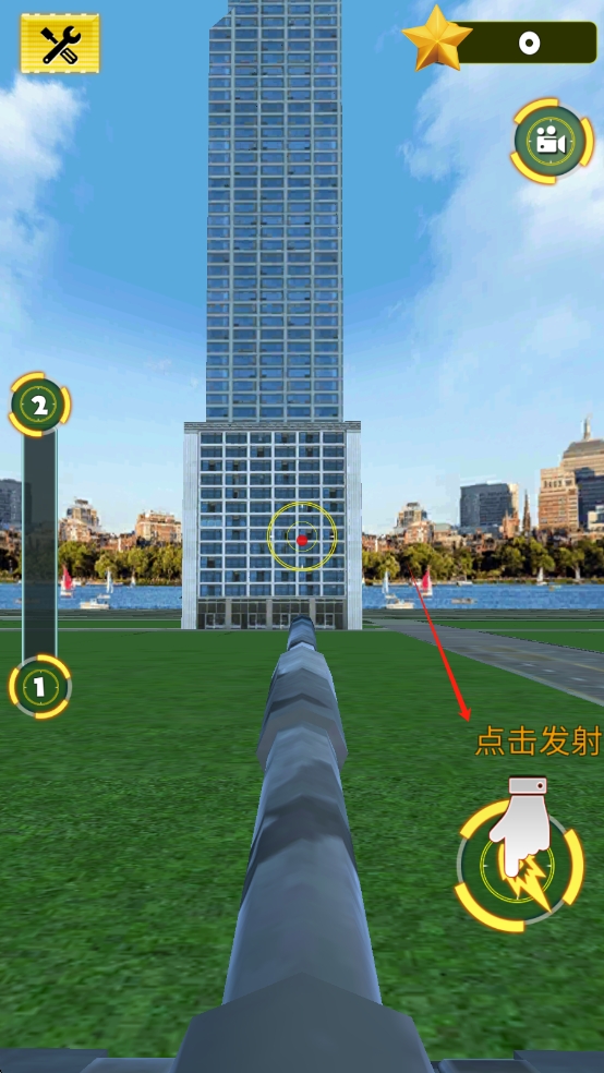 1、基础炮击操作:通过滑动屏幕控制炮台仰角与方位,长按蓄力调整发射力度,松开即可发射炮弹,精准命中目标建筑。
