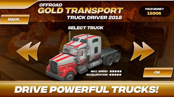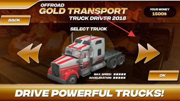 1、进入选车界面,通过左右箭头切换不同卡车,查看每辆车的性能,选好后点击确认按钮,开启运输之旅。