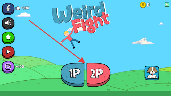 1、打开《Weird Fight》游戏,选择【1P】单人模式开始游戏,可留意左侧社交分享按钮获取奖励,右侧宠物图标可能有额外功能。