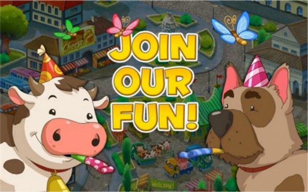 1、进入游戏主界面,可见可爱动物围绕“JOLLYDAYSFARM”标识,开启农场游戏之旅。