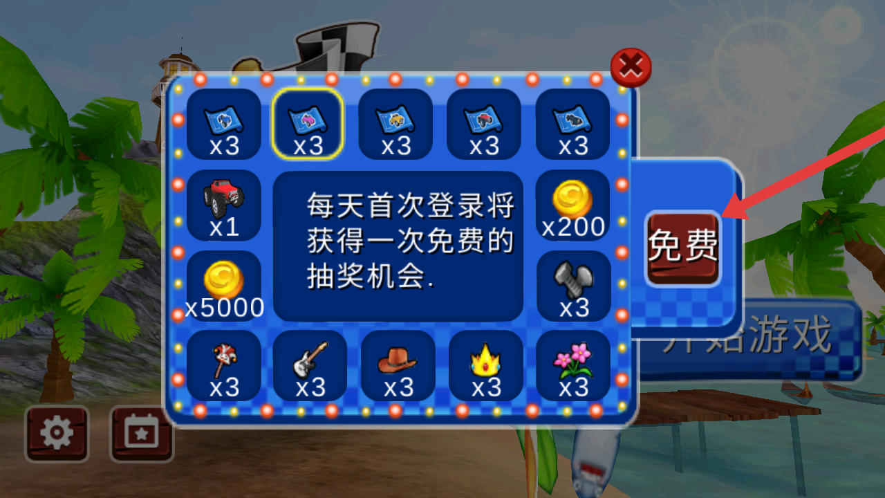 1、进入游戏后点击【免费】按钮,每天首次登录可获一次抽奖机会,获取游戏内道具。