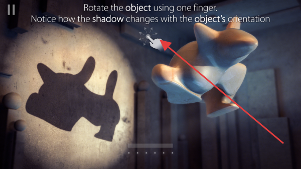 2、游戏中,按照提示【Rotate the object using one finger. Notice how the shadow changes with the object's orientation】,单指旋转物体,观察影子变化。