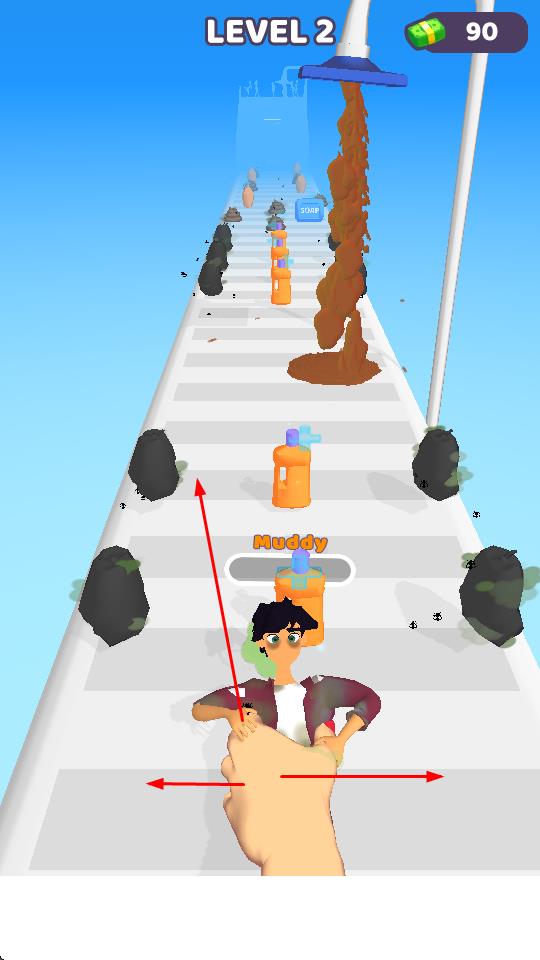 1、玩家操控角色在道路上前进,通过左右移动躲避如泥堆等障碍物,收集橙色清洁用品等道具。