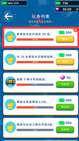 4、特色任务挑战,完成每日经营目标,获得额外奖励加速超市发展。