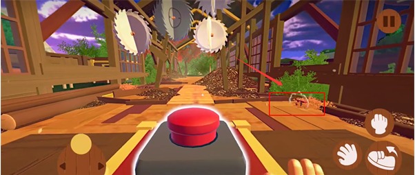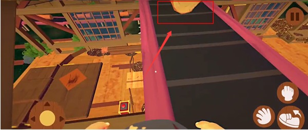 2、跑到履带的最上方,将木头推下去,砸中下方箱子上的按钮。