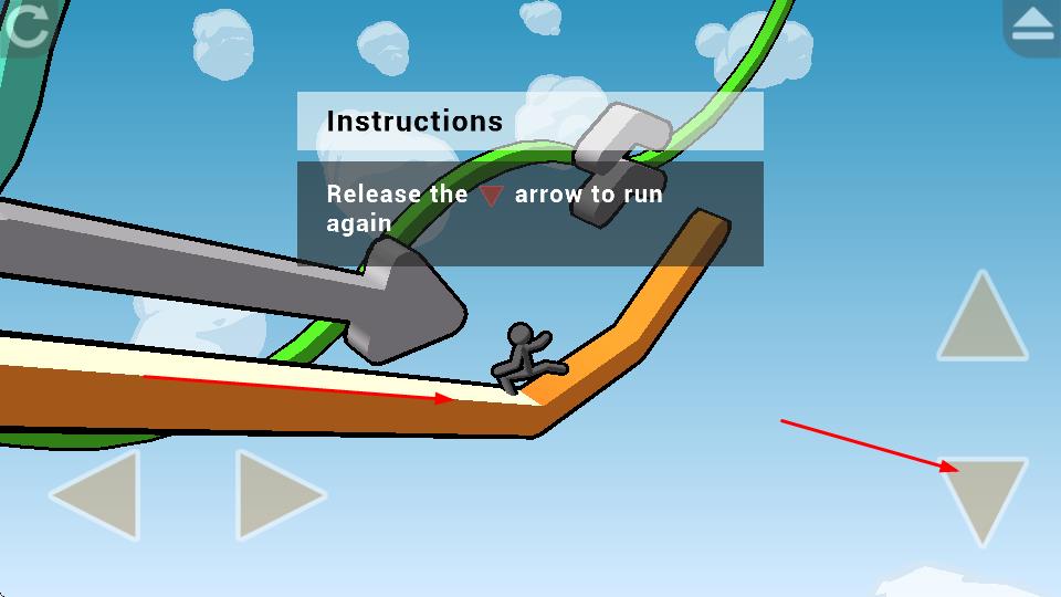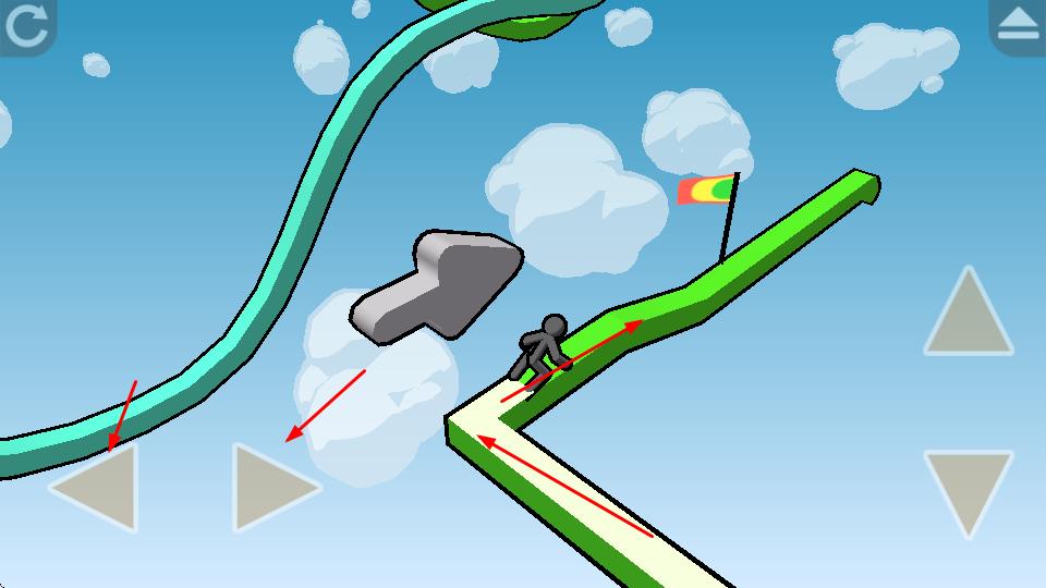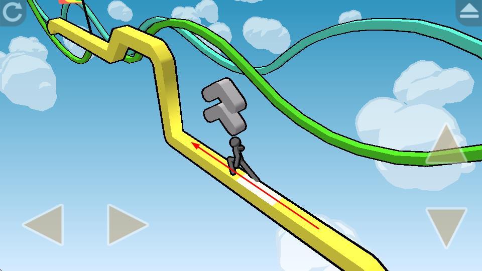 1、玩家通过点击屏幕上的三角形按钮操控火柴人在彩色道路上移动,控制其前进方向和时机。