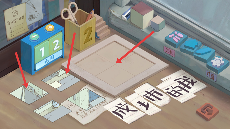 3、把左侧的四块拼图放到框中,正确拼好以后,就可以开始下一个关卡。