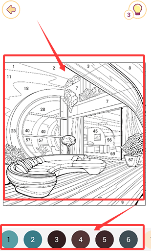 2、按数字填充颜色点击色盘中的编号,再触碰画布对应灰色区域,系统自动填充色彩。