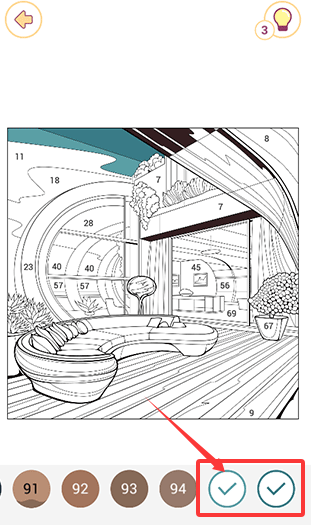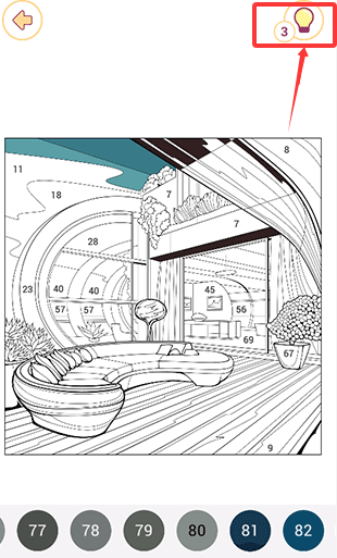 3、如果找不到未填完的色块,除了把图形放大进行寻找之外,还可以点击右上角的灯泡图标进行提示。