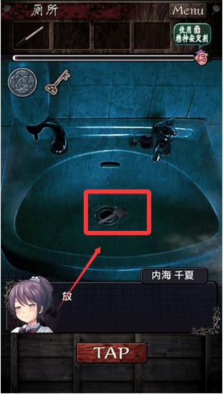 3、来到厕所,调查洗脸台,然后把里面的水给放了,获得钥匙,顺便把隔间里的木板调查一下。