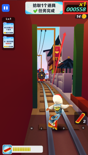 2、道具战术运用,磁铁使用时机需配合高价值区域,加速道具在跳台前使用可叠加空中速度,护盾道具在火车撞击前0.5秒激活最佳,干扰道具精准投掷阻碍对手。