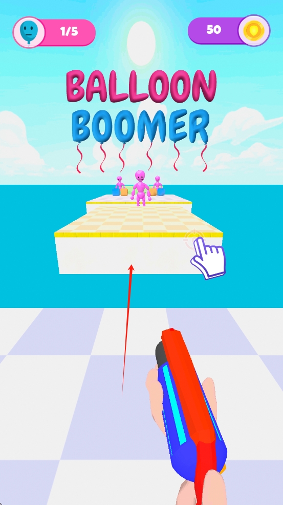 1、进入游戏,置身满是气球人的场景,握紧手中枪支,瞄准眼前飘动的气球人,扣动扳机,开启首次射击挑战。